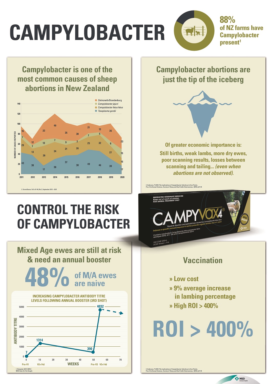Campylobacter is one of the most common causes of sheep abortions in New Zealand. Many people associate Campybacteriosis with abortions in the last six weeks of pregnancy, however trial work has shown that Campylobacter abortions are just the tip of the iceberg and of greater economic importance is: